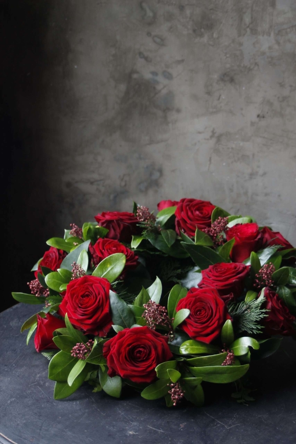 A selection of luxurious velvety deep red roses and complimentary seasonal flower, with contrasting foliage. This wreath is full of texture and interest.