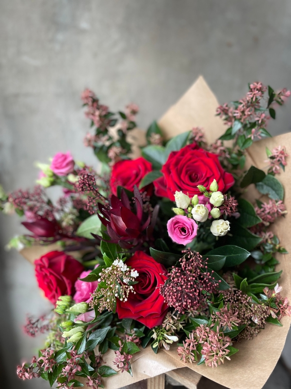 This stunning arrangement features bold red roses paired with delicate pink blooms and seasonal greenery, creating a beautiful mix of colours and textures.