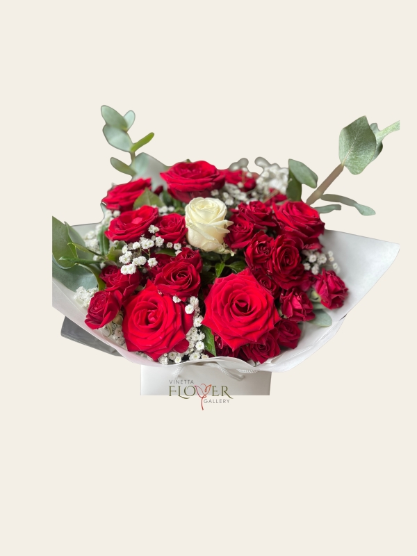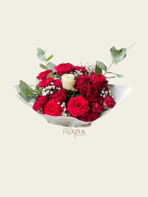 Red roses for desire, a single white for devotion — a love story in bloom.