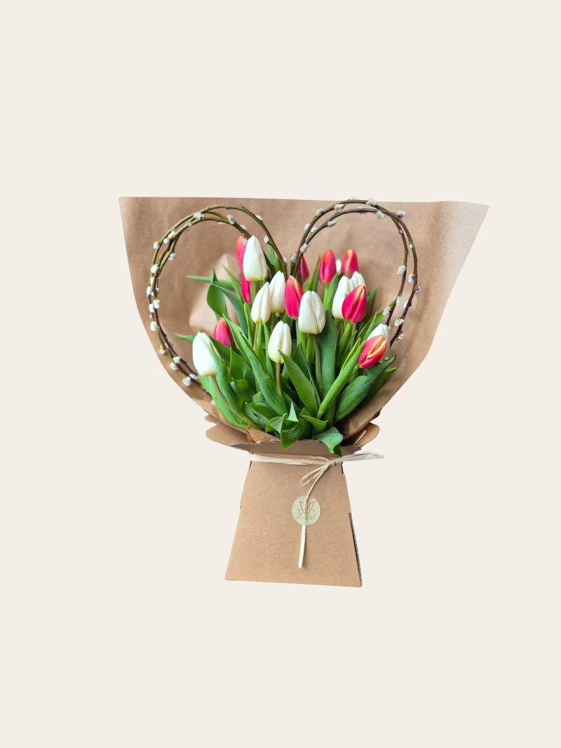 Tulip & Heart bouquet of premium seasonal tulips in soft ivory and blush tones, finished with delicate willow heart details. Timeless, elegant and beautifully romantic.