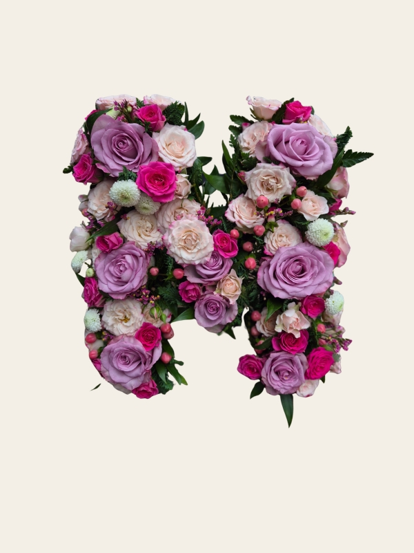 A beautiful rose-filled letter tribute created with soft pastel tones and delicate foliage.